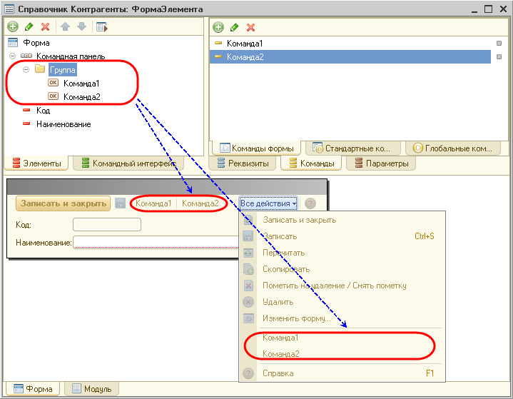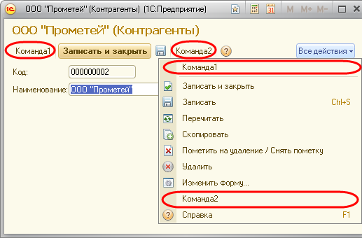 В результате в режиме 1С:Предприятия расположение кнопок, соответствующих созданным командам Команда1, Команда2 соответствует описанному выше алгоритму: в командной панели формы и в подменю Все действия сначала расположены команды, предоставляемые источником команд - формой элемента справочника (например, Записать и закрыть, Записать и др.), затем команды, созданные разработчиком (Команда1, Команда2), и затем команда Справка.