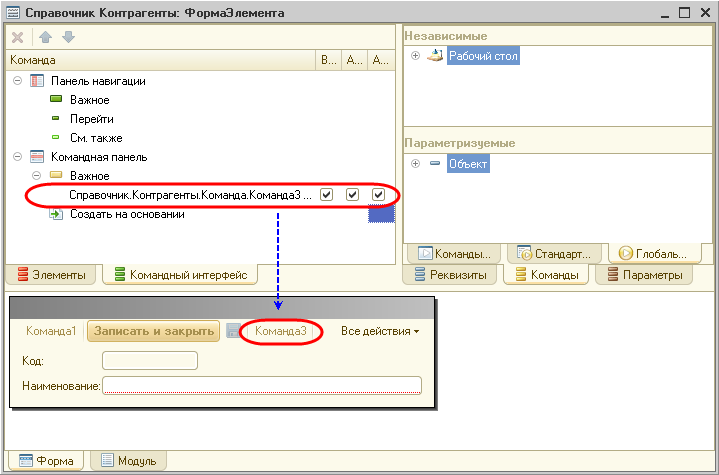 После установки этих свойств, Команда3 становится доступна закладке Командный интерфейс формы объекта, тип которого имеет команда и располагается в командной панели формы после стандартных команд, поставляемых формой элемента справочника.