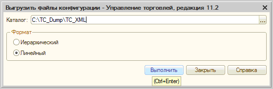 Если вы используете платформу версии 8.3.7 или выше, то в диалоге настройки выгрузки необходимо указать линейный формат выгрузки. В поле «Каталог» укажем «C:\TC_Dump\TC_XML»: