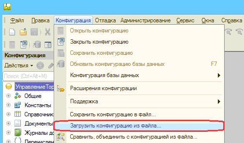 Чтобы получить начальную выгрузку тестовой информационной базы, которая пригодна для автоматического обновления на новые версии, загрузим в нашу тестовую ИБ конфигурацию базы данных, которая была до встраивания «Тест-центра»: