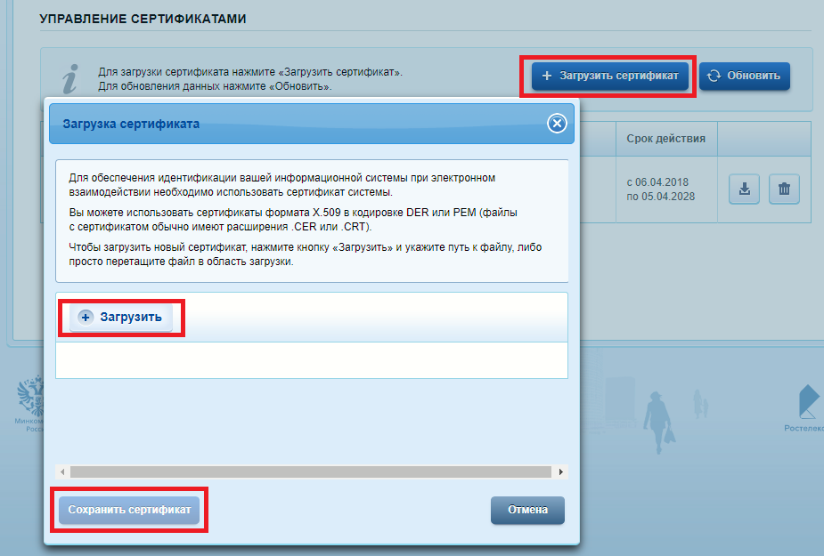 Откроется окно управления сертификатами информационной системы. Необходимо нажать кнопку «Загрузить сертификат» и в диалоговом окне нажать кнопку «Загрузить». После выбора сертификата нажмите «Сохранить сертификат». Убедитесь, что загруженный сертификат появился в списке.