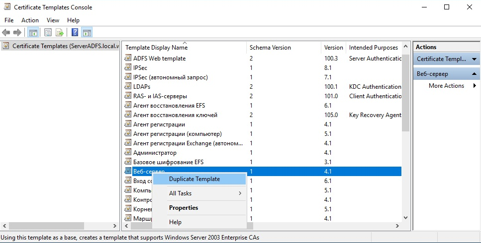 После создания шаблона сертификата можно перейти к созданию сертификата сервера, который будет использован при установке AD FS.
