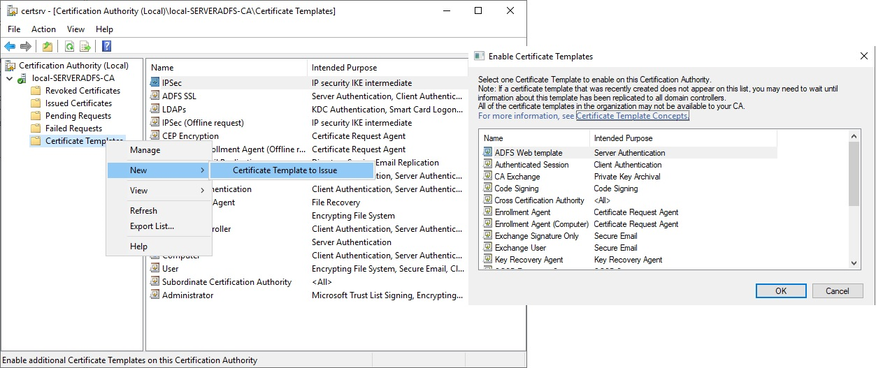 Откроется окно «Включить шаблоны сертификатов» («Enable Certificate Templates»), в котором необходимо выбрать созданный шаблон сертификата.