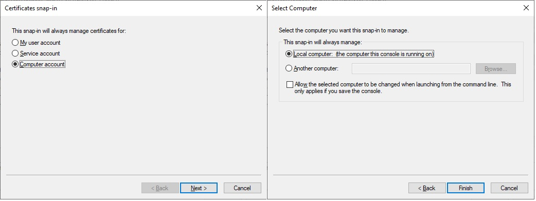 Далее необходимо выбрать пункт учетной записи компьютера («Computer account»). После в окне выбора компьютера выбрать «Локальный компьютер (компьютер, на котором работает эта консоль)»