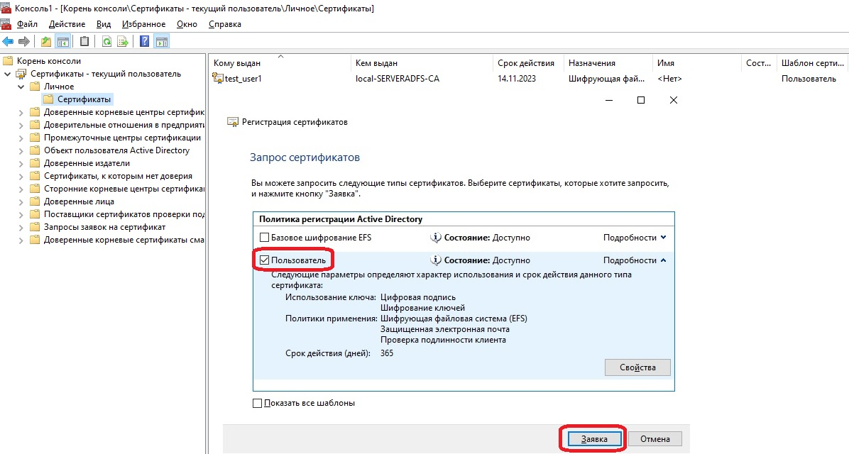 На следующем шаге откроется окно запроса сертификатов («Request Certificates»), в котором необходимо выбрать шаблон сертификата «Пользователь» («User»)