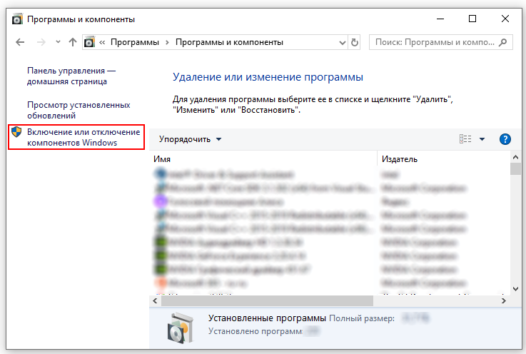 В окне "Программы и компоненты" ("Programs and Features") нажмите на кнопку "Включение и отключение компонентов Windows" ("Turn Windows features on or off").