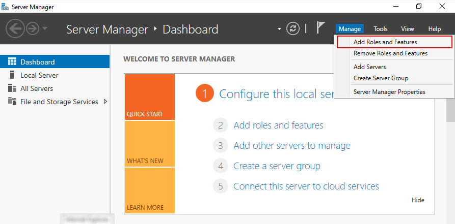 Откройте диспетчер серверов (Server Manager) и нажмите Управление – Добавить роли и компоненты (Manage – Add Roles and Features).