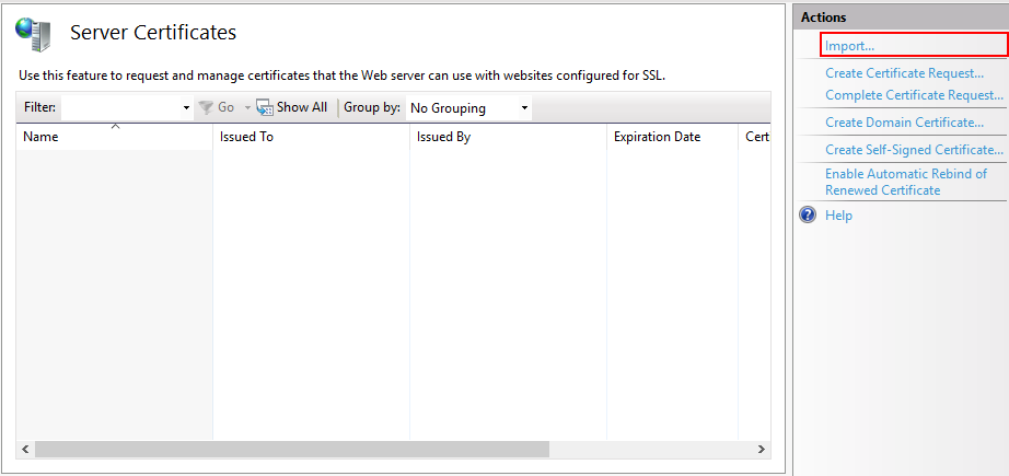 Предполагается, что сертификат получен и добавлен в список сертификатов сервера. Если сертификат получен с помощью распространенного сертифицирующего центра, то его нужно предварительно импортировать в окне "Сертификаты сервера" ("Server Certificates").