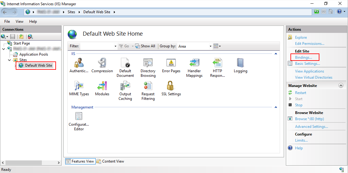 Как только сертификат появится в списке, переходим непосредственно к его привязки к публикации сайта. Для этого выделяем "Default Web Site" и в окне "Действия" ("Actions") нажимаем на пункт "Привязки…" ("Binding…").