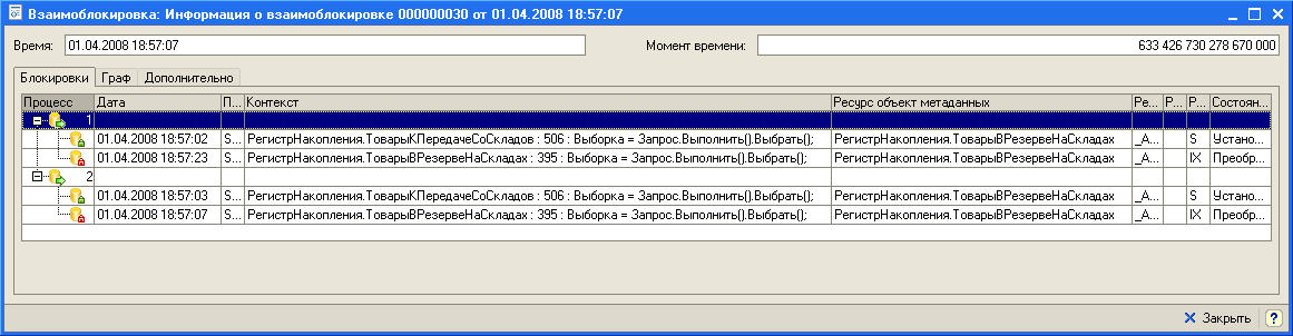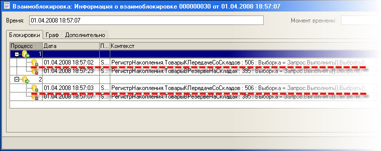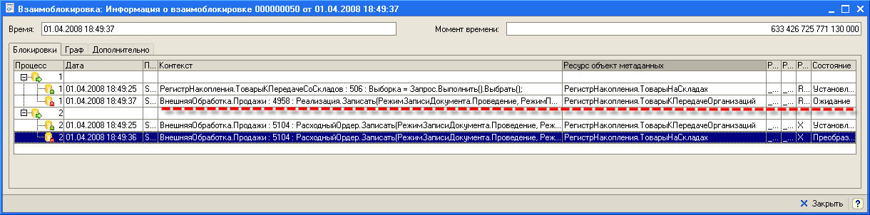 В результате этого действия устанавливается эксклюзивная блокировка на соответствующие остатки регистра "ТоварыКПередачеОрганизаций". Именно эта блокировка мешает процессу 1 установить аналогичную блокировку при выполнении действия 1.2.