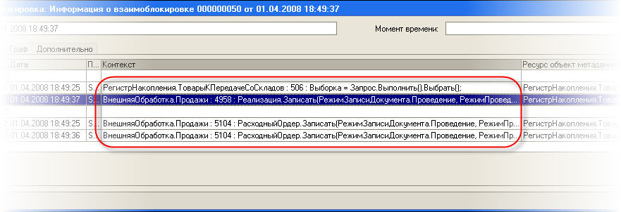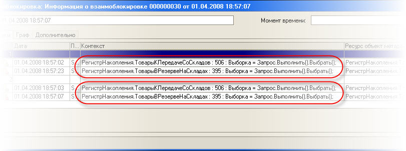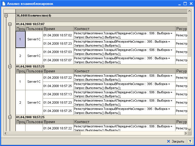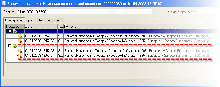 Взаимоблокировки данного вида проявляются, как правило, при конкурентном выполнении однотипных действий (например, несколько пользователей вводят документы одного вида - РеализацияТоваровУслуг). Для анализа таких взаимоблокировок обычно достаточно знать, в какой строке кода было получено сообщение об ошибке взаимоблокировки. Исходя из этого можно провести анализ кода конфигурации и решить проблему, не обращаясь к подробной информации о взаимоблокировке, предоставляемой ЦУП.