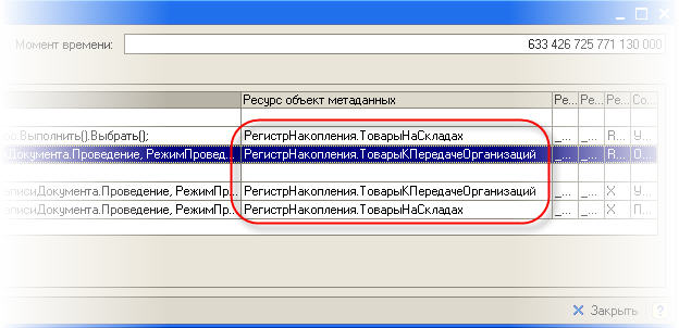 Возможна ситуация, при которой такой порядок записи движений, как в предыдущем примере, применен осознанно в связи с тем, что таков алгоритм обработки информации. Например, документ "РеализацияТоваров" должен сначала записать регистр "ТоварыНаСкладах", затем при помощи запросов к этому и другим регистрам произвести некоторые вычисления и только потом – на основании результатов этих вычислений – сформировать и записать движения регистра "ТоварыОрганизаций". В свою очередь, документ "ПоступлениеТоваров" может, наоборот, вычислять данные для регистра "ТоварыНаСкладах" на основании данных регистра "ТоварыОрганизаций".