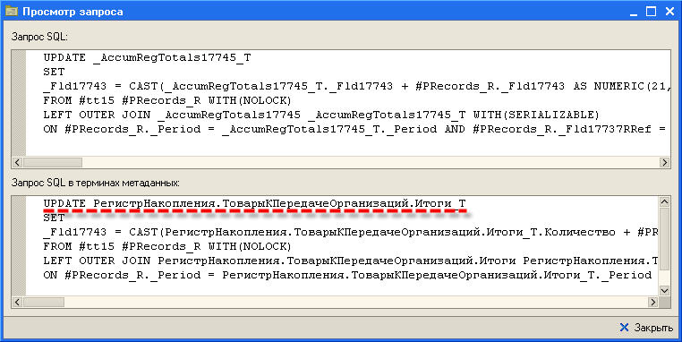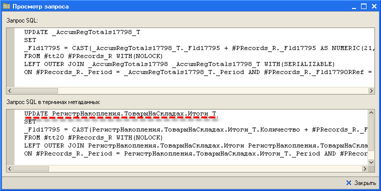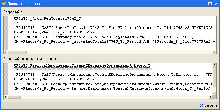 Посмотрим, какой SQL-запрос был сгенерирован платформой при выполнении этого действия.