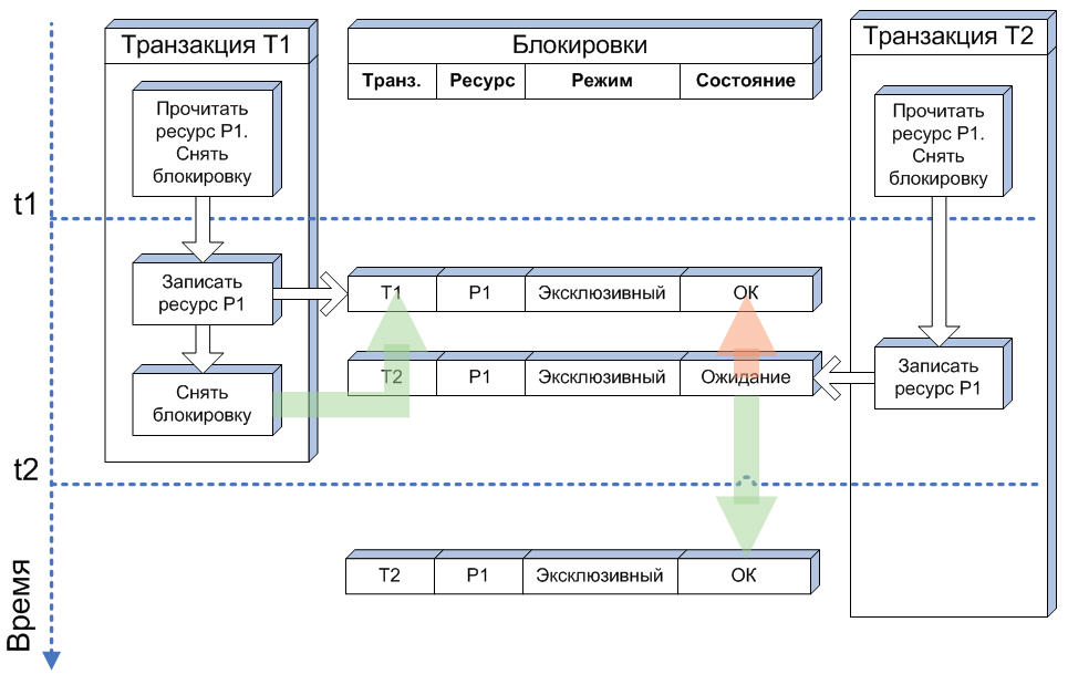 В данном случае обе транзакции, перед тем как читать ресурс Р1, устанавливают на него эксклюзивную блокировку. Одна из транзакций (Т1) успевает сделать это первой. К моменту времени t1 ресурс Р1 оказывается заблокированным в эксклюзивном режиме и транзакция Т2, которая не может установить свою блокировку, становится в ожидание на блокировке.