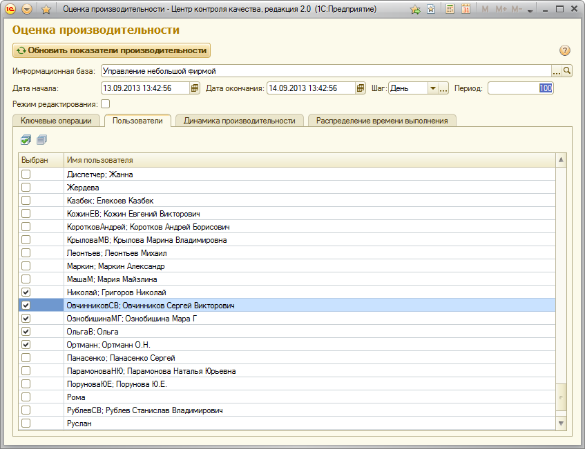 Также в обработке "Оценка производительности" существует возможность выбирать пользователей, по которых необходимо получить оценку производительности за выбранный период времени
