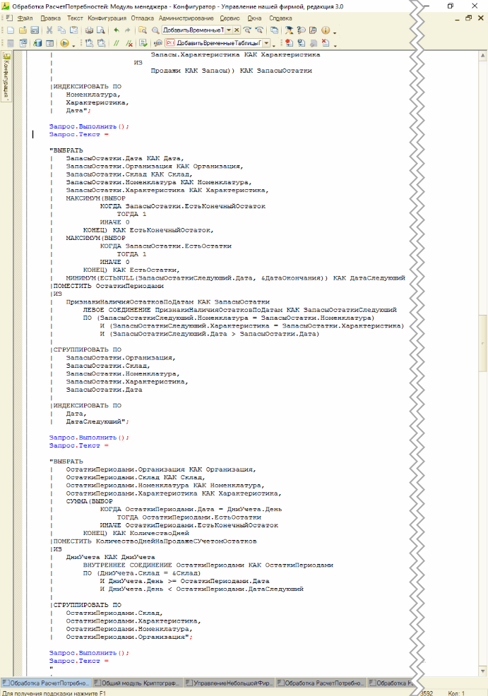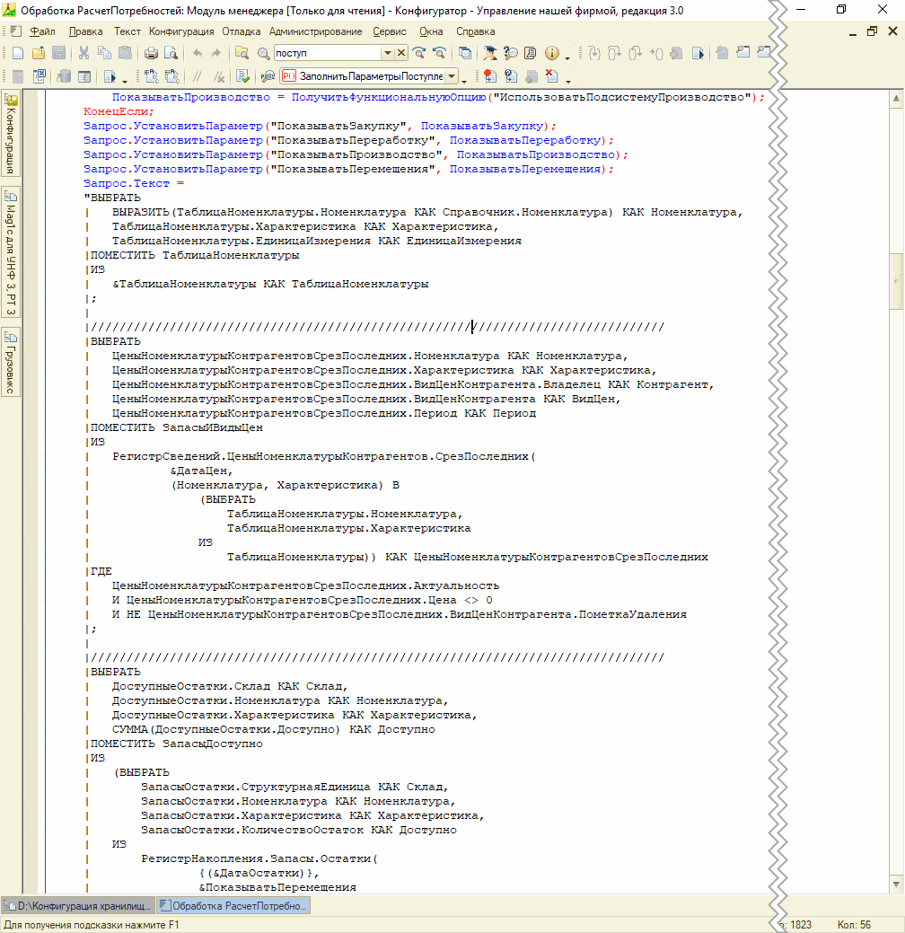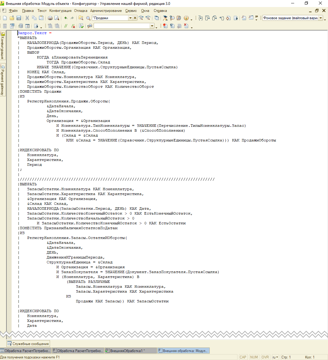 Запрос на получение продаж с учетом остатков выполняется в пакетном запросе, поэтому для удобства мы разбили его на несколько выполнений запросов, чтобы в отладчике определить какой запрос дольше всего выполняется (картинка кода) и дальше отловить проблемный запрос в трассировке (см. рис. 4).