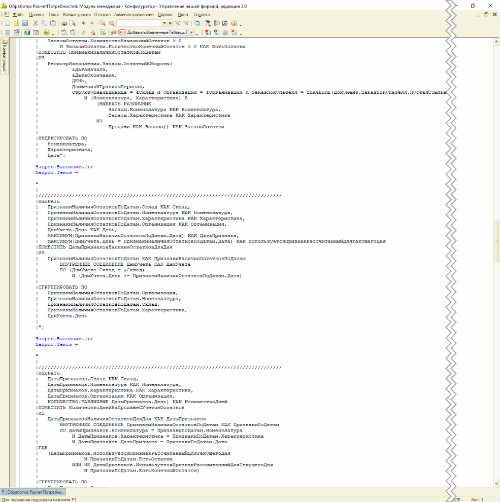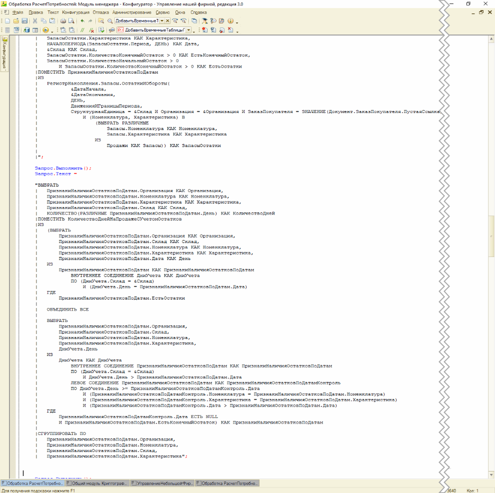 По замеру производительности, дольше всего выполнялись запросы временных таблиц ДатыПризнаковНаличияОстатковДляДня и КоличествоДнейНаПродажеСУчетомОстатков (нижние два на рис. 4)