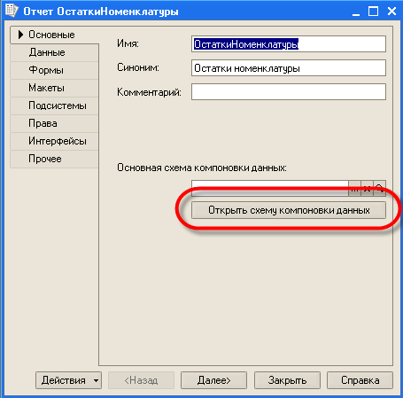 В появившейся форме введем в поле ввода "Имя" имя отчета: "ОстаткиНоменклатуры". После этого перейдем к созданию схемы компоновки данных.