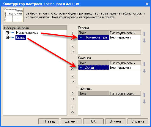 На следующем шаге нужно указать, по каким полям следует группировать строки и колонки таблицы. Мы хотим видеть в строках номенклатуру, а в колонках склад. Будем действовать соответственно - перетащим при помощи мыши поле "Номенклатура" в табличное поле строк, а поле "Склад" в табличное поле колонок.