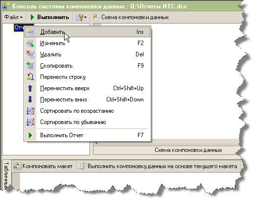 Для того, чтобы отлаживать схему в консоли компоновки данных нужно добавить схему в консоль. В консоли схемы компоновки данных располагаются в отчетах. Для создания нового отчета в консоли системы компоновки данных нужно в дереве отчетов воспользоваться командой "Добавить" и ввести имя отчета.