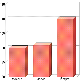 Изменение базового значения применяется в тех случаях, когда разница между значениями в диаграмме намного меньше их абсолютных значений. В этом случае графическое представление становится не информативным. Вот пример диаграммы, содержащей значения 100, 101 и 110: