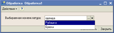 Копировать в буфер обменаПроцедура ПолеВвода1ОкончаниеВводаТекста(Элемент, Текст, Значение, СтандартнаяОбработка) Если Элемент = ЭлементыФормы.ПолеВвода1 Тогда Если Текст = "одежда" Тогда Значение = Новый СписокЗначений(); Значение.Добавить(Справочники.Номенклатура.НайтиПоНаименованию("Рубашка")); Значение.Добавить(Справочники.Номенклатура.НайтиПоНаименованию("Брюки")); СтандартнаяОбработка = Ложь; КонецЕсли; КонецЕсли; КонецПроцедуры