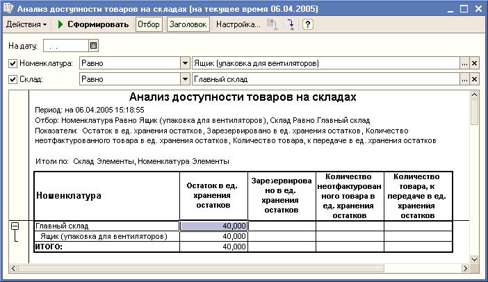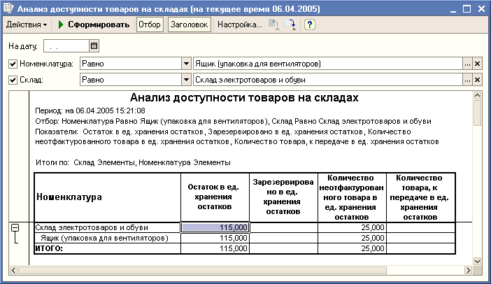 Для примера, сформируем два отчета: один - для главного склада, другой - для склада электротоваров и обуви. Сохраним их на диске C: под именами 1.mxl и 2.mxl соответственно.