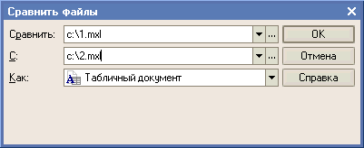 Для сравнения двух табличных документов с отчетами, хранящихся на диске, нужно выбрать команду "Сравнить файлы..." из меню "Файл". В появившемся диалоговом окне выбрать два файла, указать тип документа - табличный документ и нажать кнопку OK: