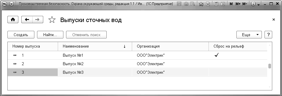 Подраздел «Выпуски сточных вод» предназначен для просмотра и формирования списка выпусков сточных вод предприятия. Чтобы открыть подраздел, нажмите гиперссылку Выпуски сточных вод в главном окне раздела. При этом открывается одноименное окно.