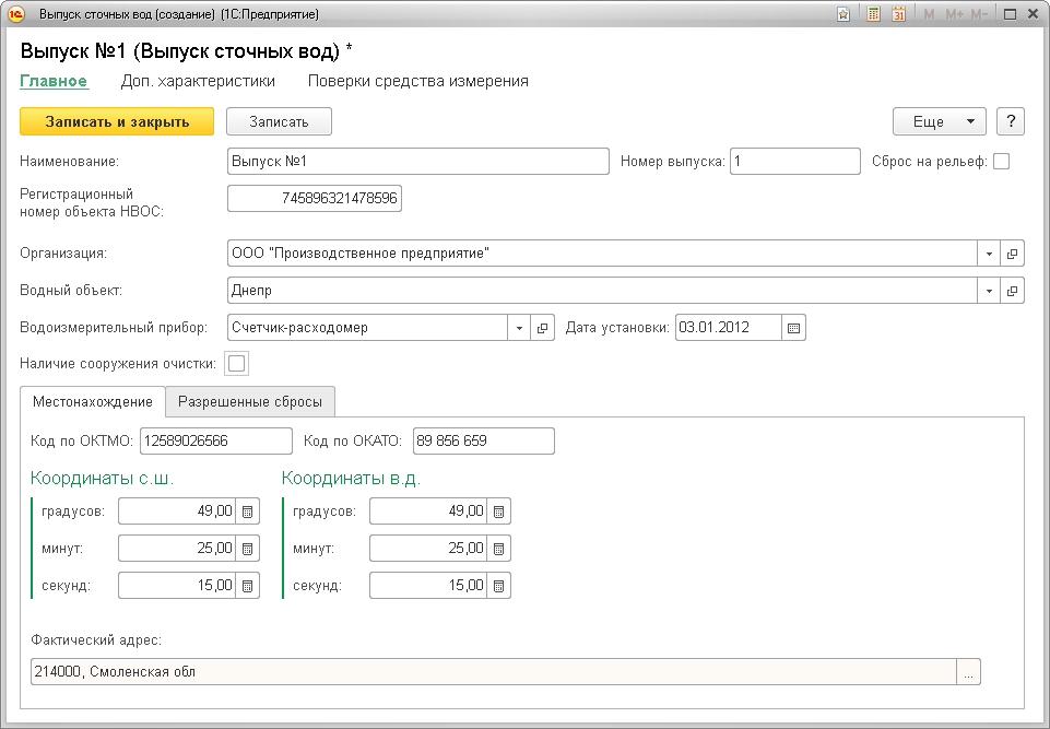 В данном окне представлен список выпусков сточных вод предприятия. Чтобы ввести данные выпуска сточных вод, следует нажать кнопку Создать. При этом на экране отображается окно Выпуск сточных вод (создание).