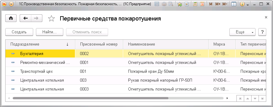 Подраздел «Первичные средства пожаротушения» предназначен для просмотра и формирования списков средств тушения пожара в начальной стадии его развития до прибытия подразделений пожарной охраны. Чтобы открыть подраздел, нажмите гиперссылку Первичные средства пожаротушения в главном окне раздела. При этом открывается одноименное окно.