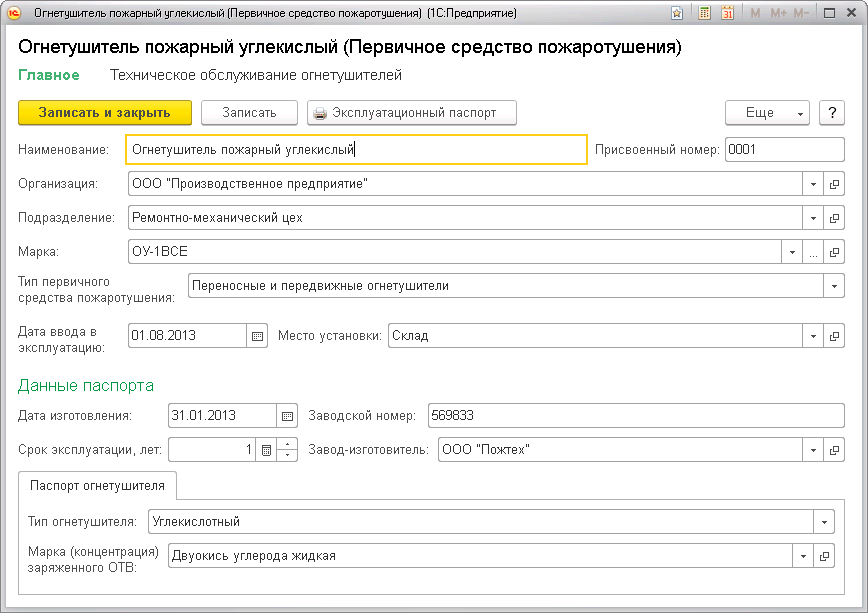 Чтобы ввести данные пожарной техники, следует нажать кнопку Создать. При этом на экране отображается окно Первичное средство пожаротушения (создание).