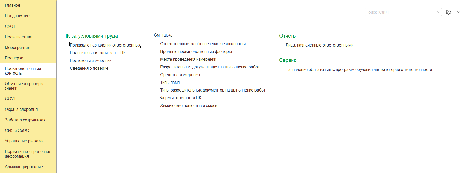 Подсистема "Производственный контроль" предназначена для ввода данных результатов проведения производственного контроля за соблюдением санитарных правил на предприятии, а также проведение производственного и экологического контроля. Главное окно подсистемы представлено ниже.