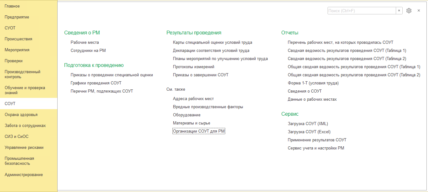 Подсистема "СОУТ" предназначена для ведения учета рабочих мест, перечней рабочих мест подлежащих специальной оценке условий труда, формирования карт специальной оценки, а также формирования отчетов о проведении специальной оценки условий труда.