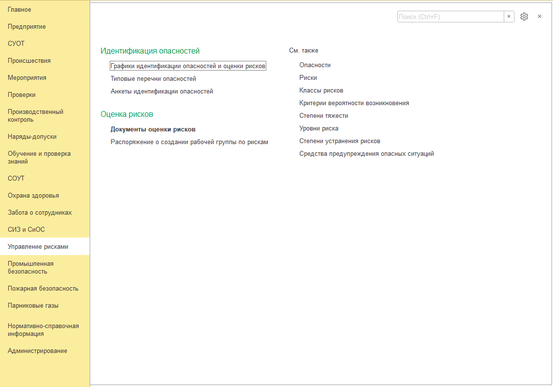 Подсистема "Управление рисками" предназначена для оценки и управления профессиональными рисками. Оценка рисков является составной частью системы управления охраной труда организации, направленной на формирование и поддержание профилактических мероприятий по оптимизации опасностей и рисков, в том числе по предупреждению аварий, травматизма и профессиональных заболеваний.