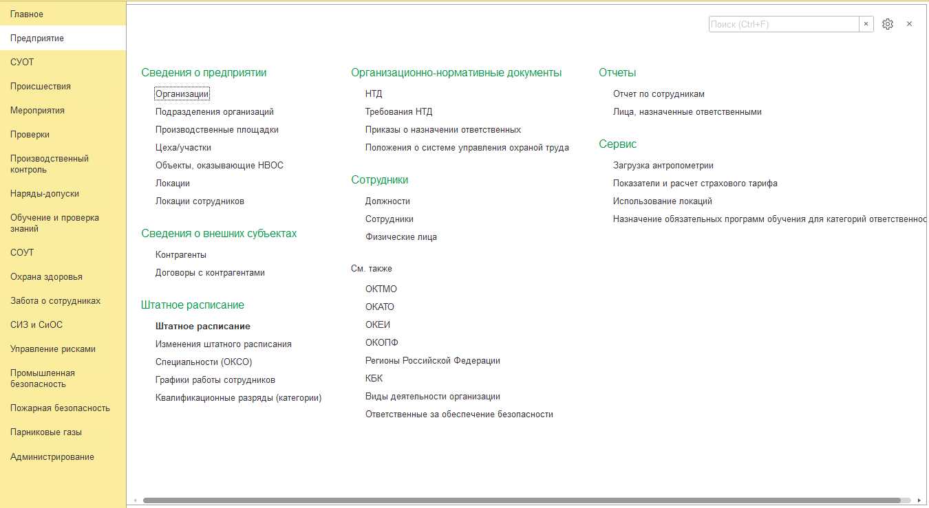 До начала практического использования прикладного решения необходимо ввести начальные данные. Этот процесс подробно рассматривается в настоящей главе. Действия по вводу начальных данных выполняются в разделе "Предприятие". Раздел предназначен для ввода данных реквизитов организации, подразделений, внешних организаций, а также формирования перечня физических лиц, сотрудников и должностей в штатном расписании. Также в разделе можно провести расчет страхового тарифа для взносов в ФСС по производственному травматизму.