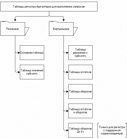 Все таблицы регистра бухгалтерии можно разделить на две группы: реальные и виртуальные. Реальные таблицы предоставляют доступ посредством запроса к физически существующим в информационной базе таблицам. У регистра бухгалтерии таких таблиц две: основная таблица и таблица значений субконто, которая создается в информационной базе после добавления в конфигурацию механизмов аналитического учета.