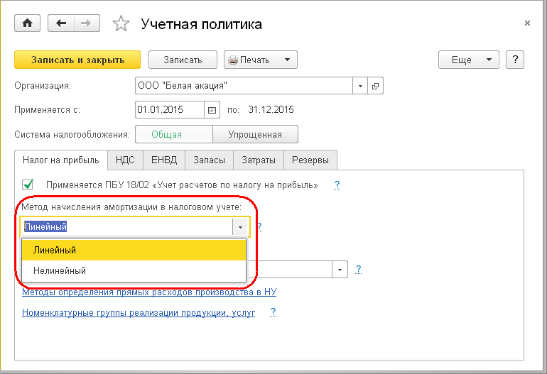Рис. 4.101. Установка метода начисления амортизации для целей налогообложения прибыли организаций