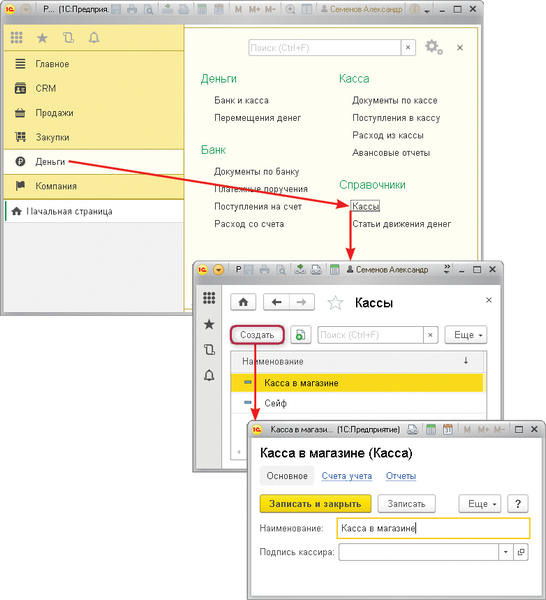 Обратите внимание, что вы можете вести учет наличных денег в нескольких кассах. Для создания списка касс выполните действия, приведенные на рисунке ниже.