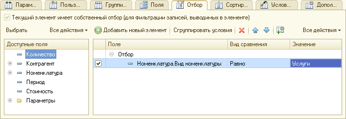 Главный отбор используется для фильтрации записей, выводимых в отчет. В приведенном примере в настройках отчета Продажи номенклатуры установлен отбор по виду номенклатуры (рис. 3.224).