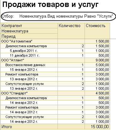 В результате в отчет выводятся только продажи услуг (рис. 3.225).