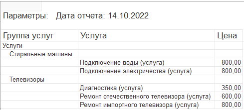 Следующий отчет — Перечень услуг — будет содержать информацию о том, какие услуги и по какой цене оказывает ООО «На все руки мастер» (рис. 13.85).