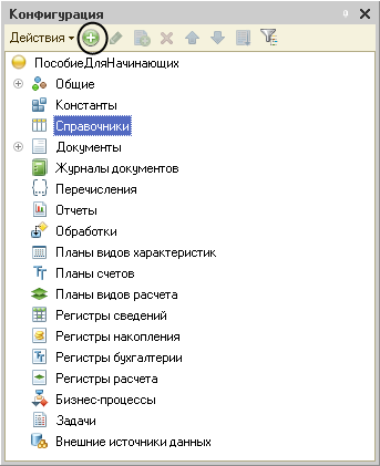 Откроем в конфигураторе нашу учебную конфигурацию, выделим в дереве объектов конфигурации ветвь Справочники и нажмем кнопку Добавить в командной панели окна конфигурации (рис. 3.16).