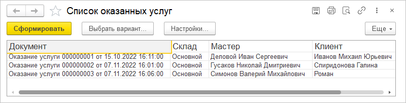 Для начала, используя систему компоновки данных, вы создадите простой линейный отчет Реестр документов оказание услуги.