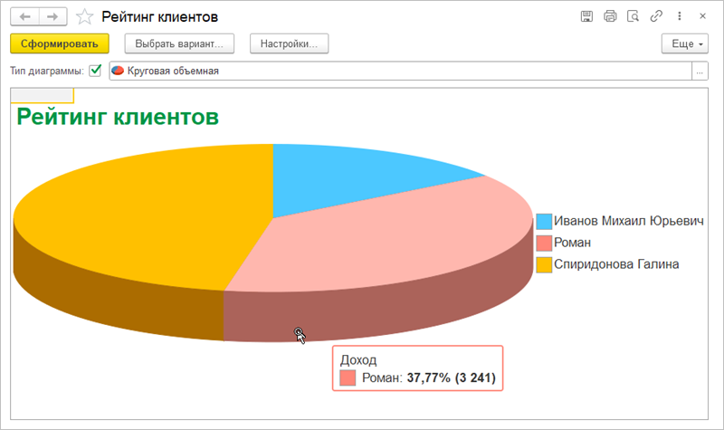 Следующий отчет – Рейтинг клиентов – будет показывать в графическом виде, каков доход от оказания услуг каждому из клиентов за все время работы ООО «На все руки мастер» (рис. 14.85).
