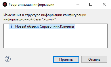 Поскольку вы создали в конфигурации справочник, при запуске проекта в информационной базе будет создана одна или несколько таблиц для хранения данных справочника. Соответственно, каждый раз после создания объектов конфигурации, вносящих изменения в структуры хранения данных, от вас потребуется подтвердить реорганизацию информационной базы. Нажмите Принять (рис. 3.23).