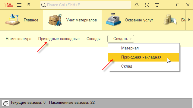 Как вы видите, в разделах Бухгалтерия и Учет материалов появилась команда Приходные накладные для открытия списка приходных накладных. Кроме того, в разделе Учет материалов в подменю Создать появилась команда Приходная накладная для создания новых документов этого вида (рис. 4.7).