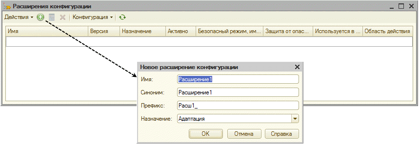 Чтобы создать расширение конфигурации, нужно вызвать команду главного меню Конфигурация – Расширения конфигурации и в открывшемся списке расширений нажать кнопку Добавить. Затем необходимо указать имя расширения, его синоним, префикс и назначение расширения (рис. 1.7).