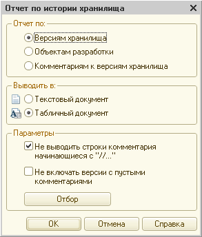 Хранилище конфигурации позволяет выполнять несколько видов отчетов по истории хранилища. Такие отчеты имеют двоякое назначение: с одной стороны, они могут использоваться для внутренних целей (например, для отслеживания хода разработки), а с другой стороны – для формирования сопроводительной документации к выпускаемым версиям конфигурации.