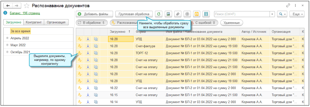 В продукте "1С:Распознавание первичных документов" (1С:РПД) есть функция, которая позволяет одновременно обрабатывать сразу несколько документов, что существенно экономит время.